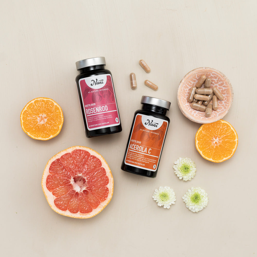 Det Energiske Par er sammensat til jer, der elsker at være aktive, til jer, der nyder en løbetur eller cykelture i det frie, og til jer, der har planer om en livsstilsændring med mere aktivitet i hverdagen. Med Det Energiske Par får du mere mentalt overskud til at starte din rejse med en mere aktiv livsstil takket være den adaptogene Rosenrod, samt vores C vitamintilskud fra hele acerola kirsebær.