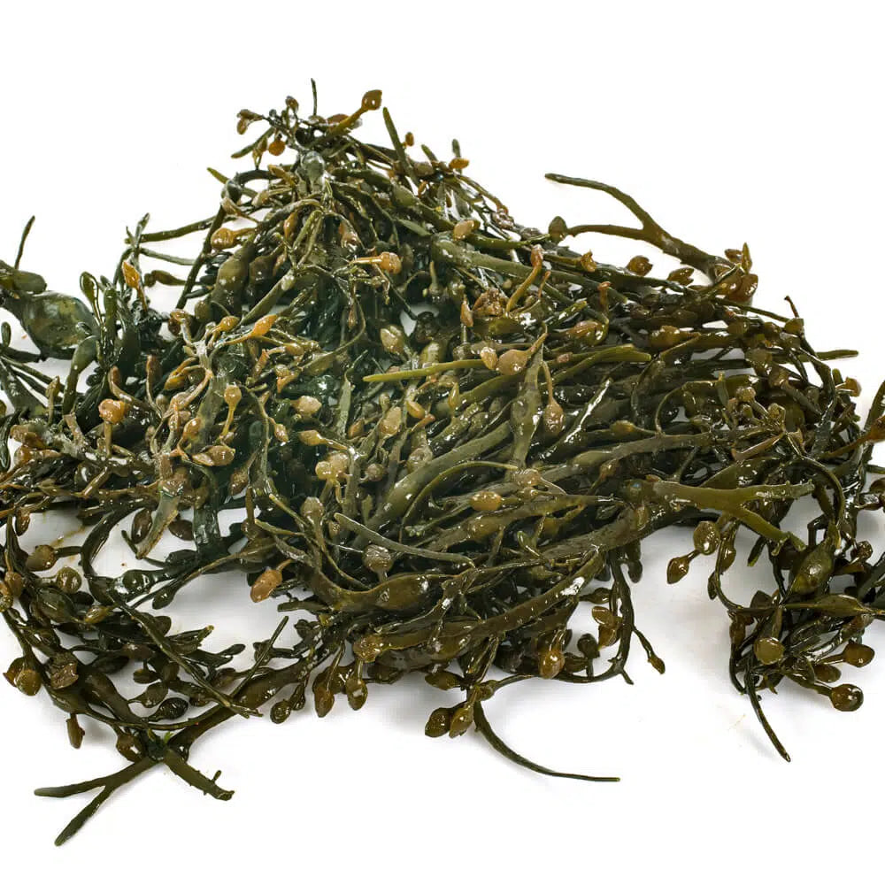 Blæretang hel, renset og pulveriseret. Blæretangen indeholder en masse plantenæringsstoffer såsom fibre og flavonoider, men har desuden også et naturligt indhold af organisk jod.